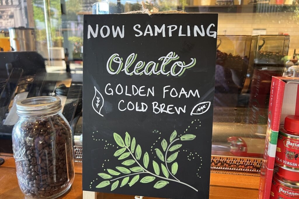 There are at the moment two options: a latte infused with additional virgin olive oil and a toffee nut iced shaken espresso with “golden foam,” which is made with vanilla candy cream infused with the additional virgin olive oil into a chilly foam.